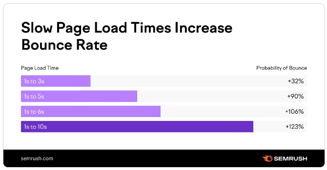 Loading times can make or break your conversion rate. In fact, a Semrush study found that the probability of a user leaving a website increases by 90% if the page takes up to 5 seconds to load.