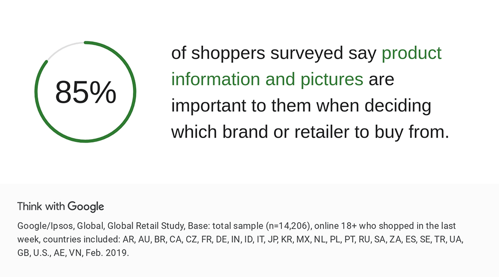 Shoppers buying online can't touch or try out your products before they make a purchase. That's why product descriptions and images are vital. According to Think with Google, 85% of online shoppers say product information and images are important when deciding which store or brand to buy from.