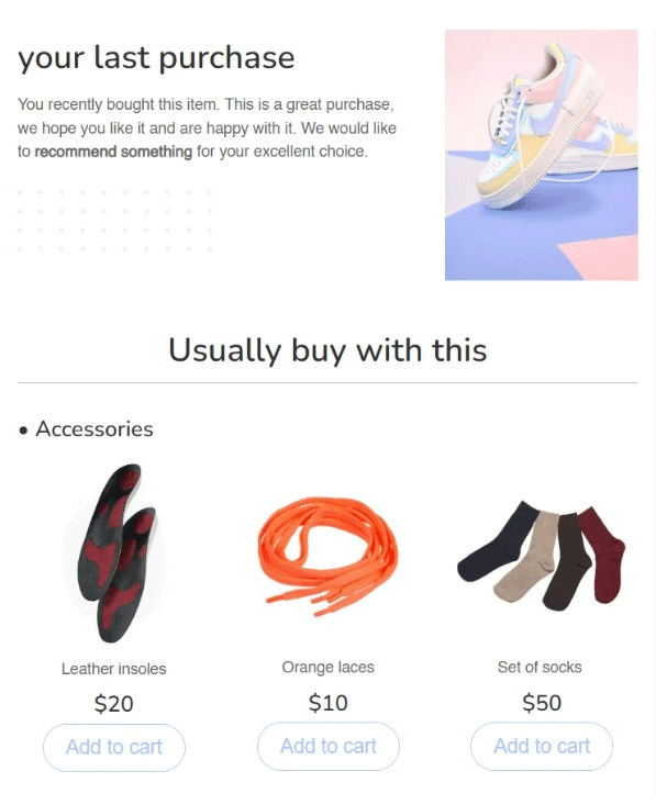 Make sure that your recommendations are based on recent customer activity. If someone has already bought an item, they won't want to receive an email promoting the same product.