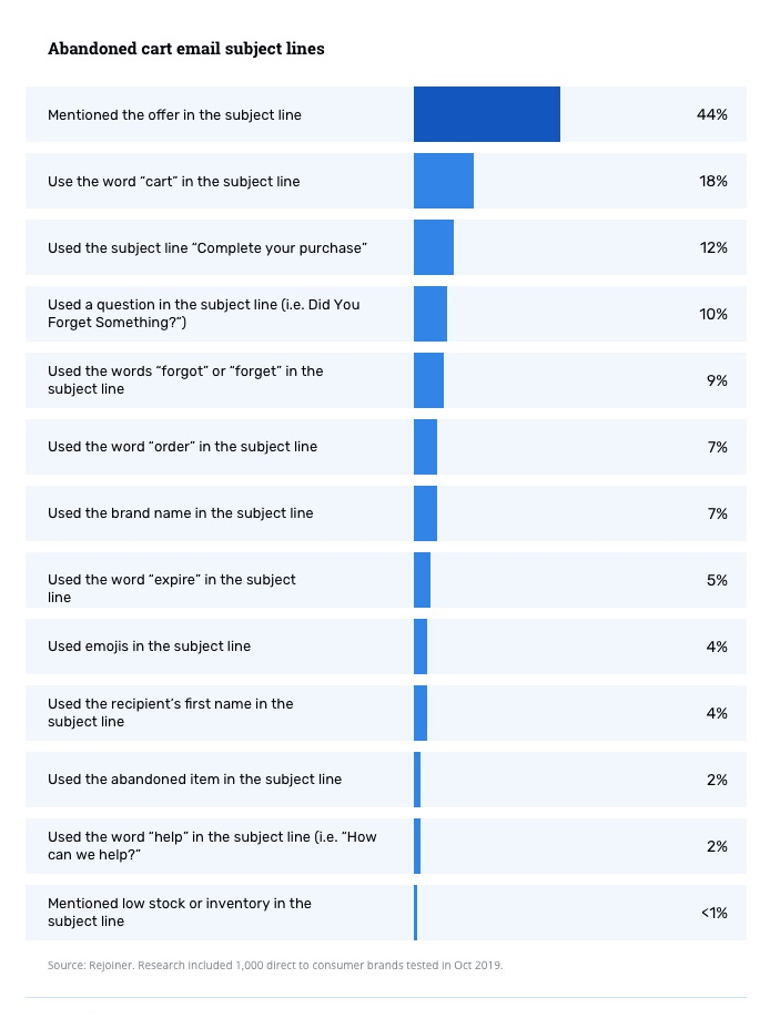 Subject lines are one of the easiest things to A/B test. So, you can learn what works by looking at what other eCommerce sites are doing. And 44% of companies mention their offer right in the subject line: