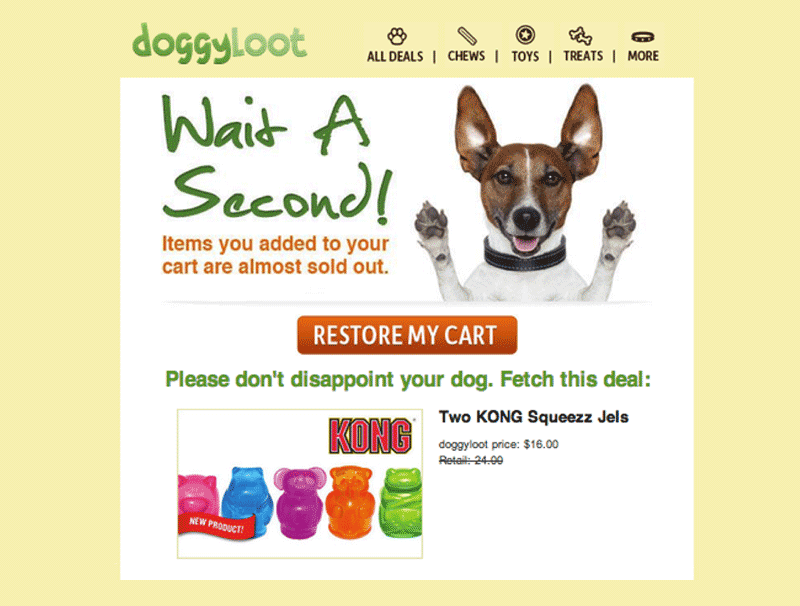 Here's an example of a clever, concise, and very on-brand abandoned cart email from pet food site Doggyloot: