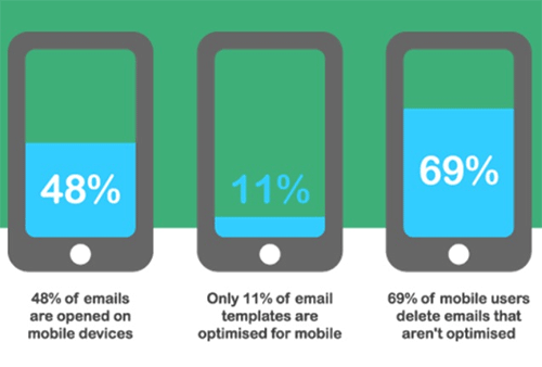 48% of people open emails on mobile, and 69% delete non-optimized emails