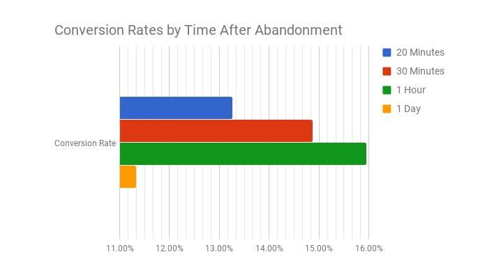 Timing is everything when it comes to abandoned cart emails. Sending your email within 1 hour of cart abandonment can achieve a 15% conversion rate. However, the conversion rate drops by 27% if you wait a full day.