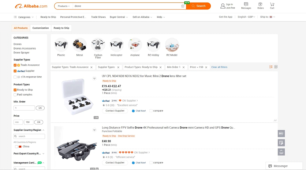 Alibaba is a user-friendly marketplace. It’s not as easy as SaleHoo and other platforms designed for dropship products, but you can use filters to narrow your search and find products with no minimum order quantity.
