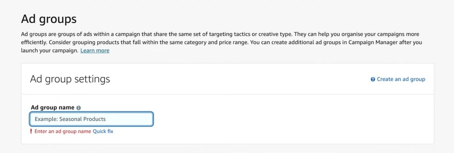 The next step is to give your ad group a name. Using descriptive names can be helpful if you plan to run multiple ad groups within a campaign.