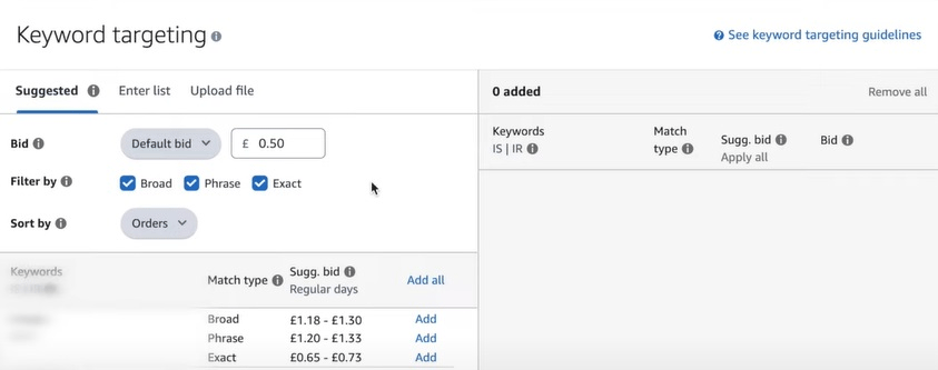 Amazon takes care of keyword selection for you. It analyzes relevant shopper searches and determines the keywords that best match your product. It then distributes your budget across different match types: