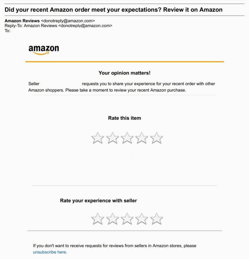 The review request comes from Amazon. This adds authenticity and credibility to the email.