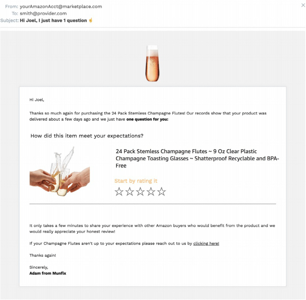 Avoid words like “love” or “happy” when asking for feedback. Instead, use neutral language to make sure you stay within Amazon’s guidelines on incentivized reviews.