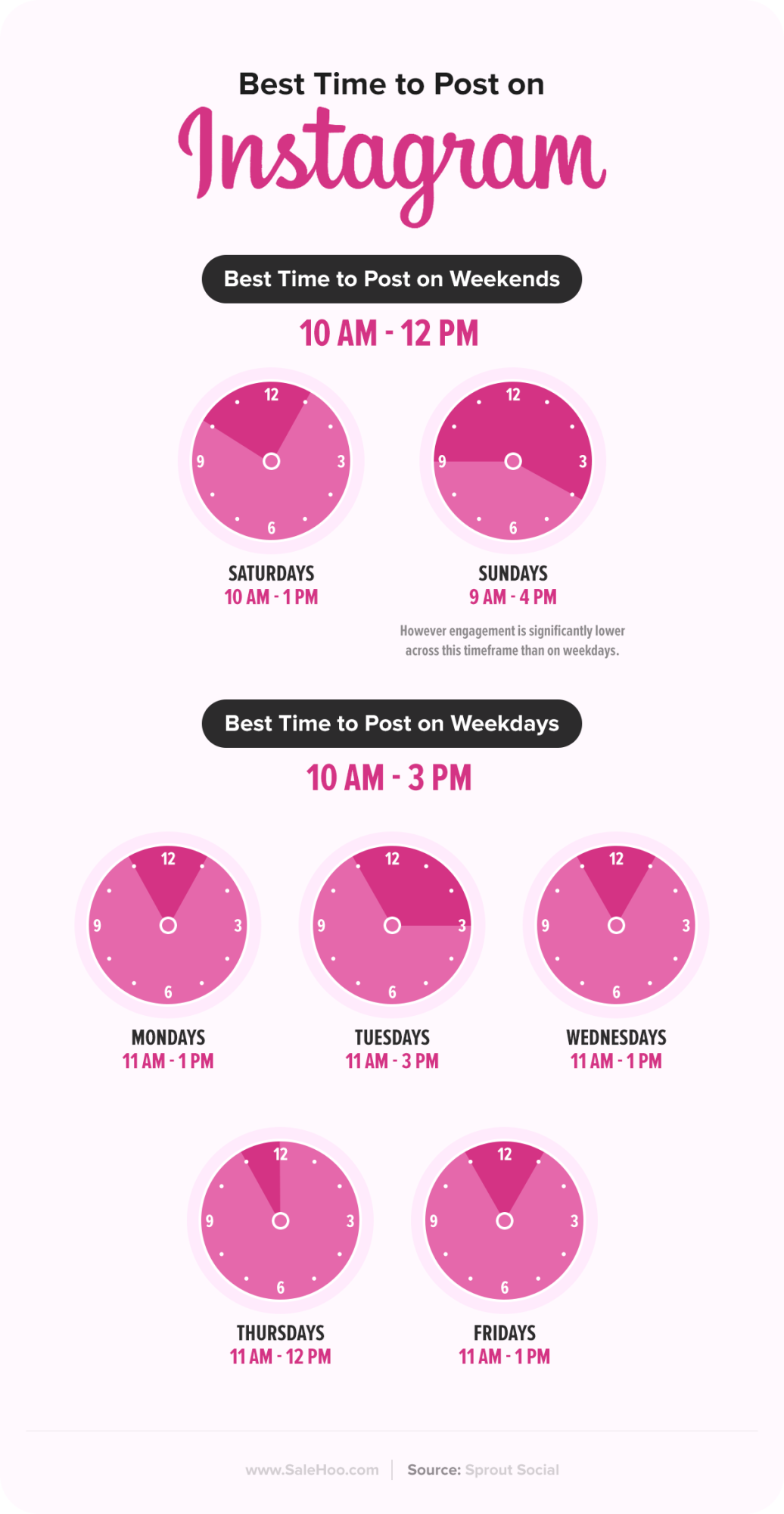 Overall, the global best times to post on Instagram are before work, during lunch and after work, which seems all very logical. An analysis from Sprout Social identified that specifically between 10.00 am to 3.00pm on weekdays is when Instagram usage is highest, which means this would be the best times to do Instagram marketing.