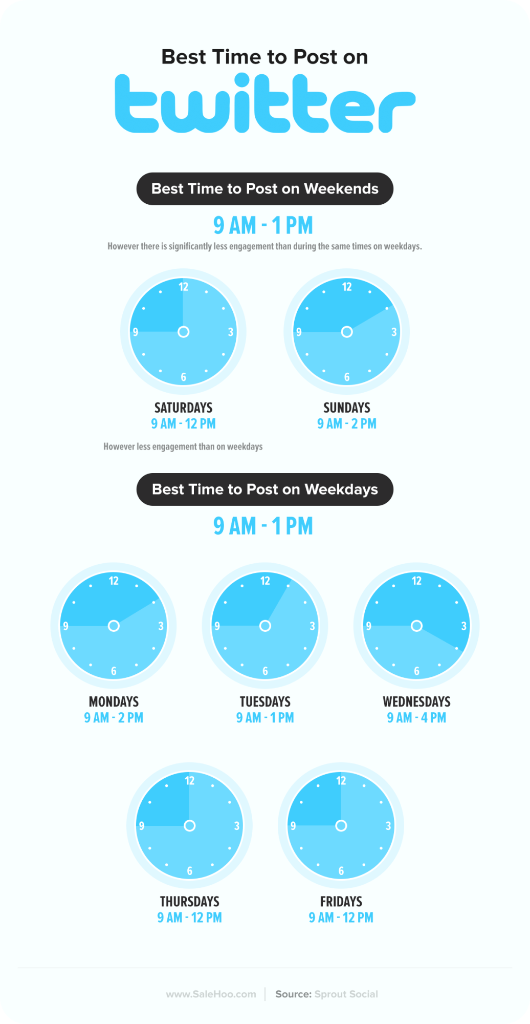 The best global times to post on Twitter are weekdays between 9.00 am and 12.00 pm. Twitter with a morning cup of coffee, maybe?