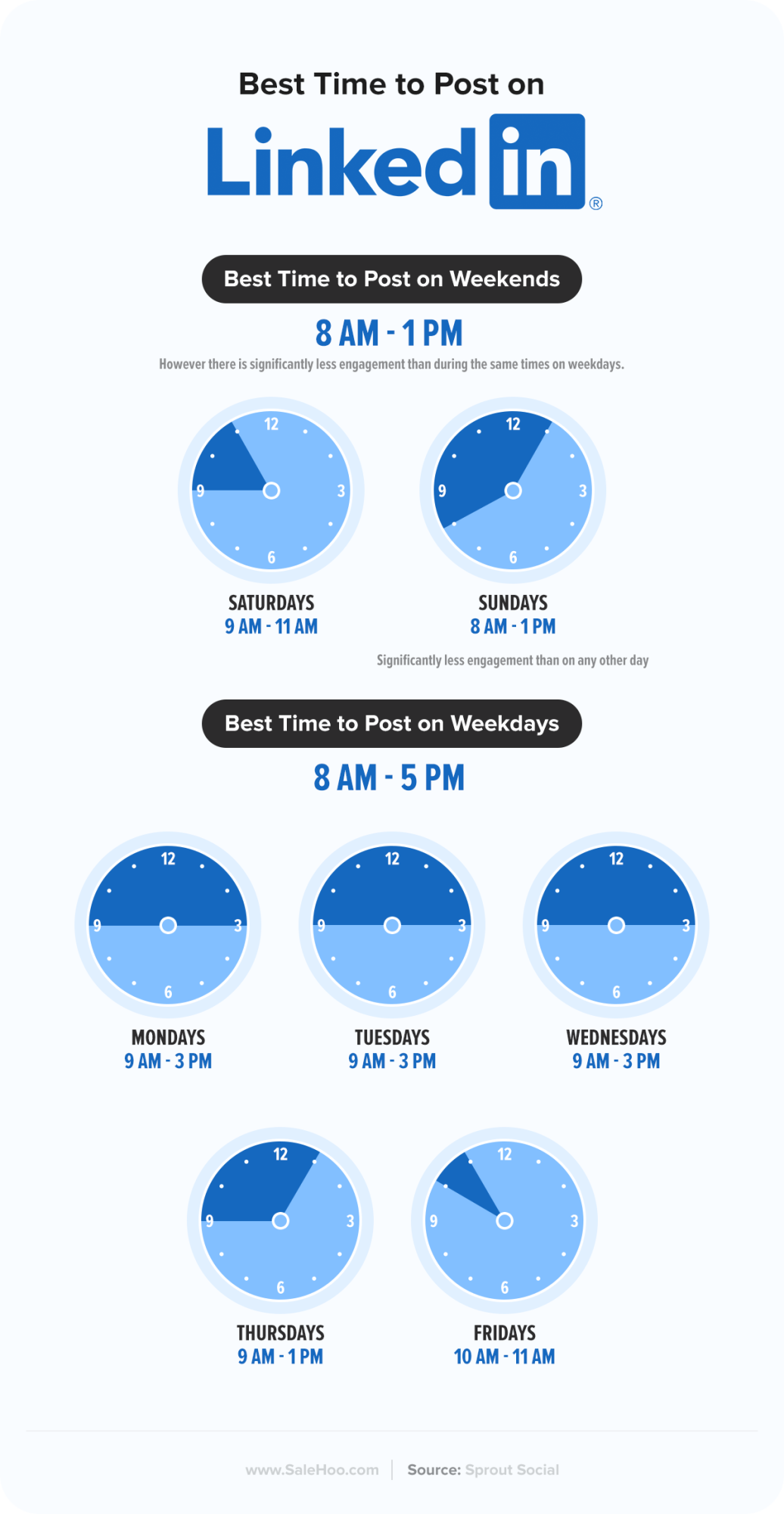 LinkedIn is unsurprisingly the most busy during working hours, that is between 8.00 am and 5.00 pm on weekdays.