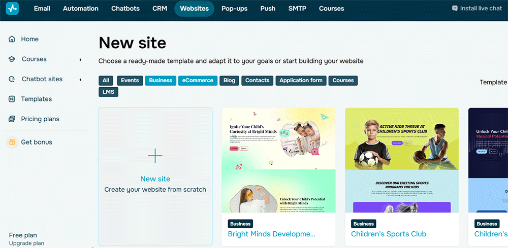 A lesser-known but still good no-code website and landing page builder that is easy to use, with an intuitive drag-and-drop interface and customizable templates. You can build a sleek, minimalistic website with responsive design, ensuring it looks great on all devices. It also includes essential integrations like pop-ups, live chat, and chatbots, providing a seamless user experience. Fast performance is key for visibility and engagement, and that's exactly what basic websites are designed to deliver. SendPulse’s website builder is an ideal choice for small businesses. It's affordable yet scalable, offering room to grow as your business needs evolve.