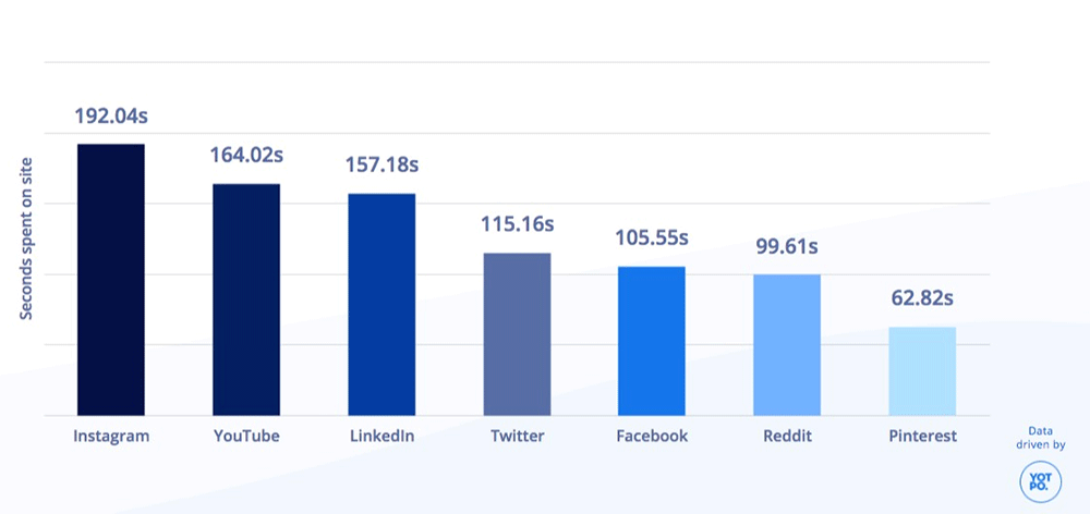 Instagram is also a visual platform that’s super engaging. It's one of the best places to showcase products. In a recent Yotpo study, Instagram was the platform with the highest time spent on site per user session.
