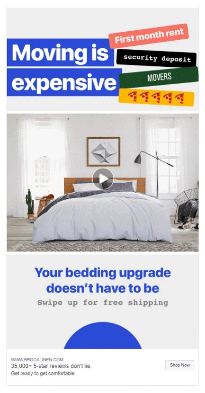 That's why many brands use Stories to promote specific offers or flash sales. For example, Brooklinen uses Stories to promote its free shipping offer in a video targeting people who are moving.