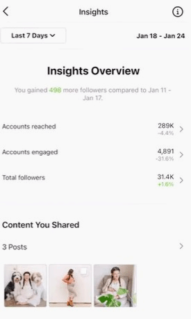 Simply tap the menu icon (three horizontal lines) in the top right corner and select 'Insights' to open up your Insights dashboard. You'll see a quick snapshot of reach, followers, and other important metrics over the past 7 days.