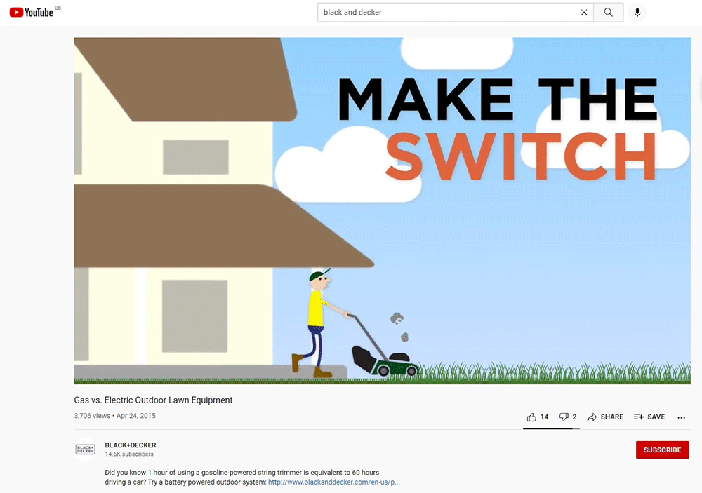 This video from Black+Decker promotes its range of electric lawn equipment by comparing its products' efficiency and environmental impact to gasoline-powered alternatives.