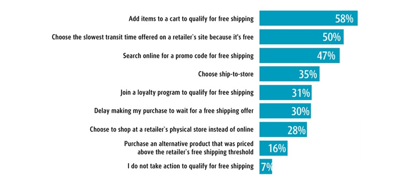 Free shipping thresholds are a great way to boost average order value. You set a minimum spend limit to unlock free shipping. According to a study by UPS, 58% of online shoppers have added extra items to their shopping carts to qualify for free delivery.