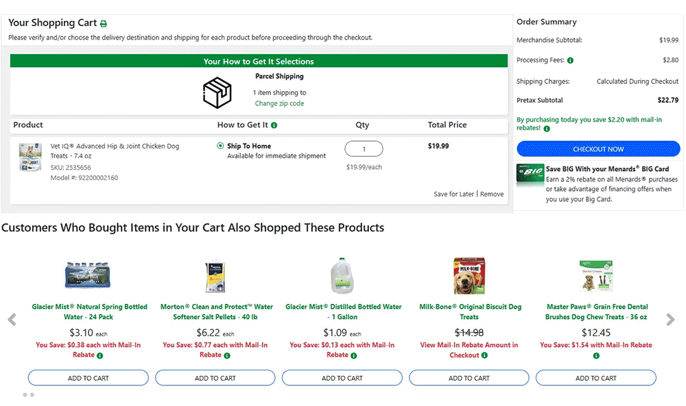 Have you ever shopped at Menards online? When you add dog food to your cart, you’ll get recommendations for dog treats, dental chews, and other relevant products on the checkout page. These personalized recommendations enhance the shopping experience.