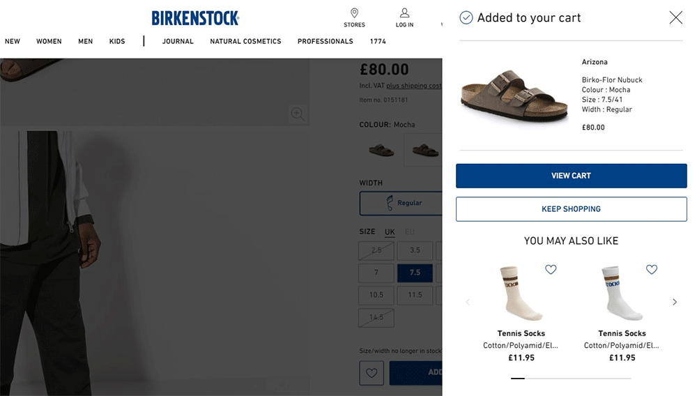 Birkenstock has mastered this approach. If you add a pair of Birkenstocks to your cart, you’ll see a pop-up that contains a couple of related products you might be interested in. The pop-up doesn’t interfere with the user experience. It feels like a helpful suggestion rather than a cross-selling technique.