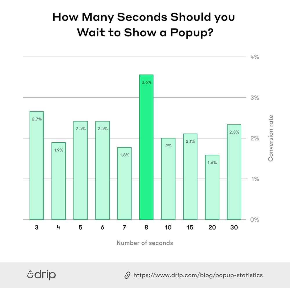 A study by Drip revealed that an 8-second wait achieves the best pop-up conversion rate: