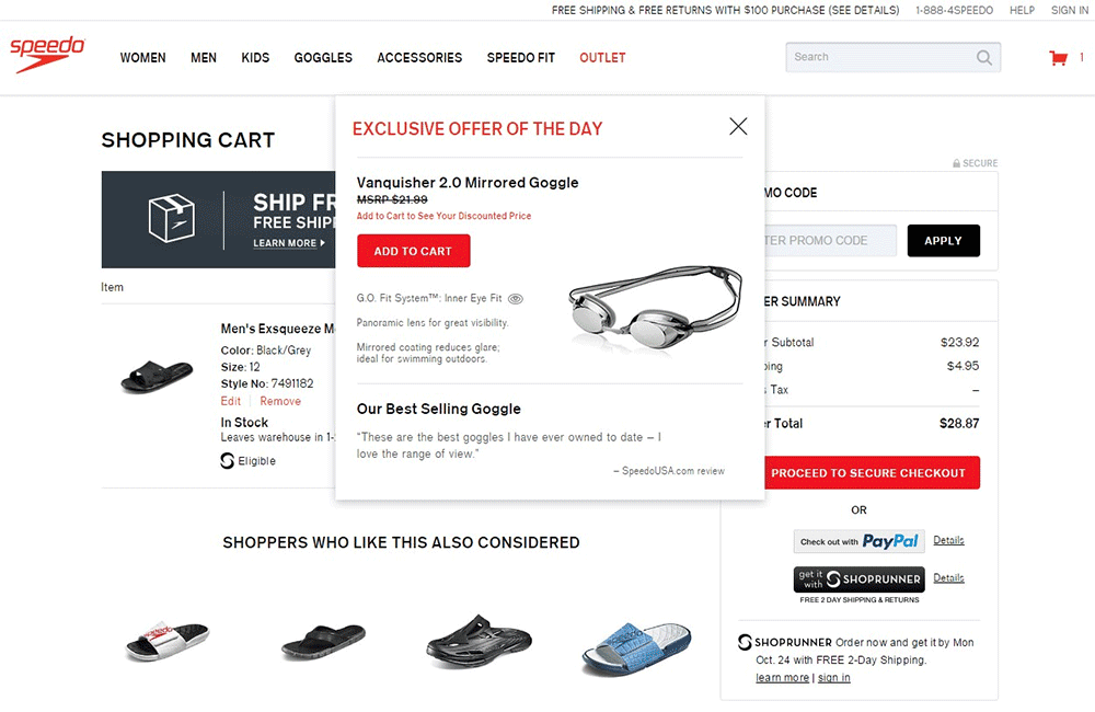The swimwear brand Speedo is an excellent example of how to use pop-ups for eCommerce. While looking at swimwear or flip-flops, you get a well-timed pop-up for goggles or another related product. Speedo often includes a discount to make the offer more appealing.