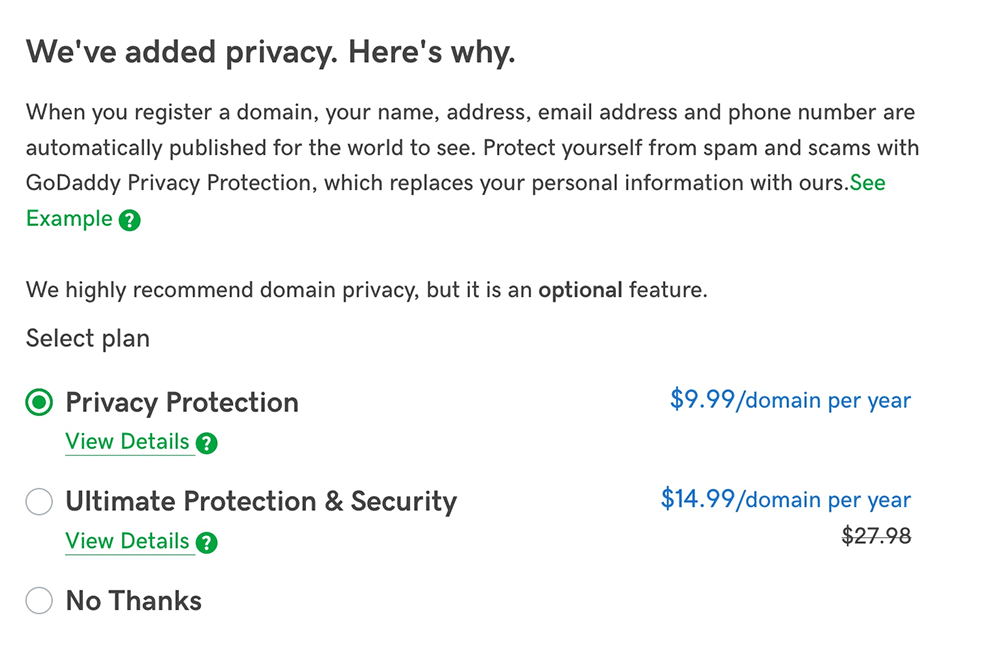If you’ve ever bought a domain from GoDaddy, you’ll have seen this tactic in action. After you buy your domain, GoDaddy directs you to a Thank You page with a deal on a related product like SSL certificates or customer privacy protection.