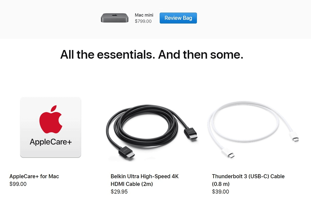 Apple designs products that work exceptionally well together. And they do a great job of capitalizing on cross-selling opportunities. When you purchase an iPhone, Apple suggests a protective case and AirPods. If you buy a MacBook, you’ll be nudged towards AppleCare+, and HDMI and Thunderbolt cables.