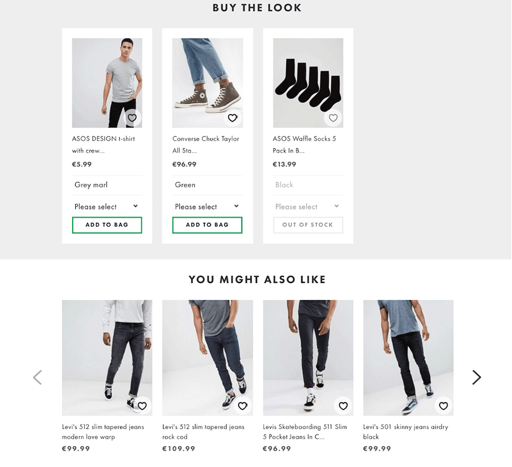 ASOS does a great job of showcasing entire outfits. When a shopper is interested in jeans, ASOS suggests shoes and t-shirts to complete the outfit. Shoppers get a curated ‘look.’