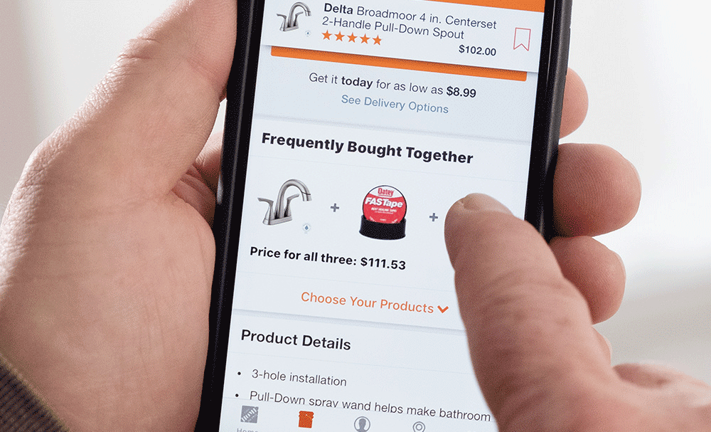 When customers look for specific items, Home Depot suggests additional items required to complete the project. For example, shoppers looking to buy kitchen faucets are shown related products like water filter units and plumber tape.
