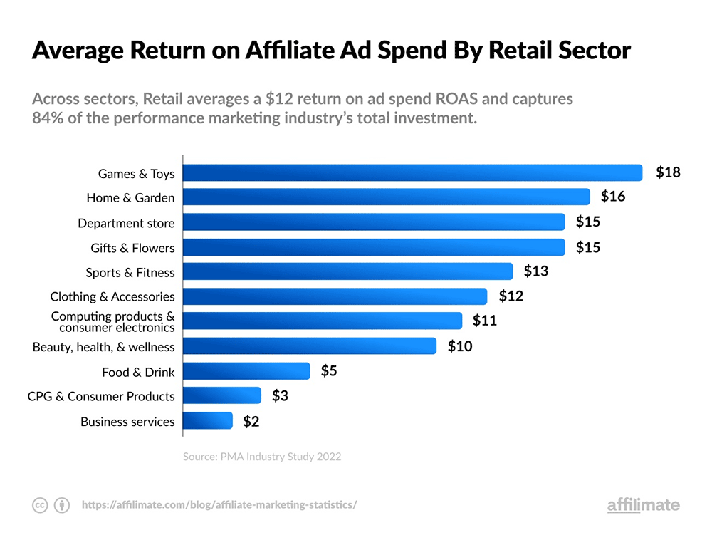 You can use affiliate marketing to expand your reach and get your products in front of new audiences. It can be very cost-effective. A recent study found that retail businesses earn an average of $12 for every dollar they spend on affiliate marketing.
