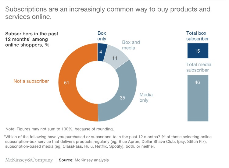 While most people have a Netflix or Spotify subscription, shoppers have started to use subscription services for eCommerce products. A McKinsey study found that 15% of online shoppers have used an eCommerce subscription service in the past 12 months: