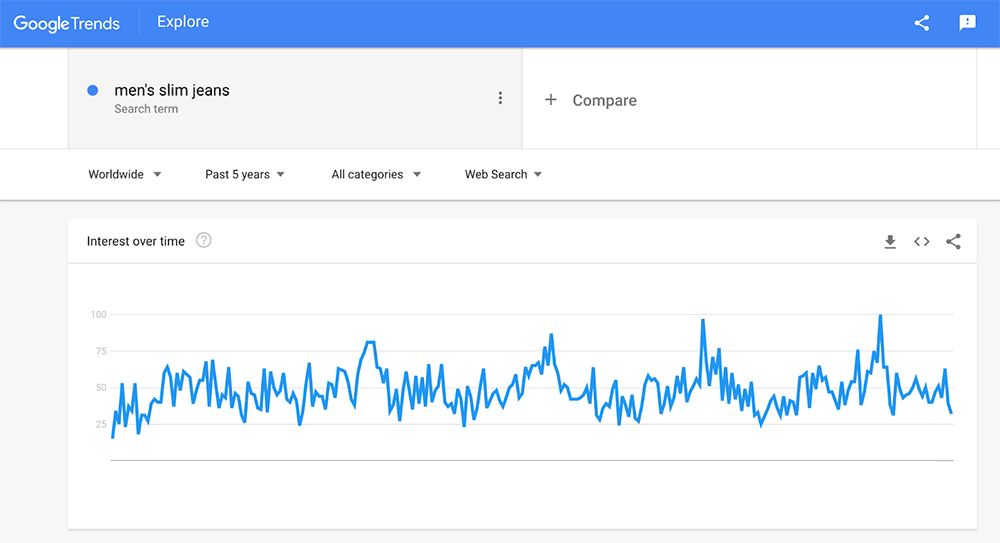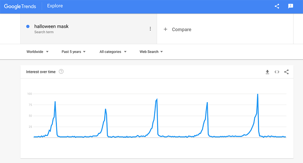 A seasonal product should look like a series of peaks and valleys on Google Trends.
