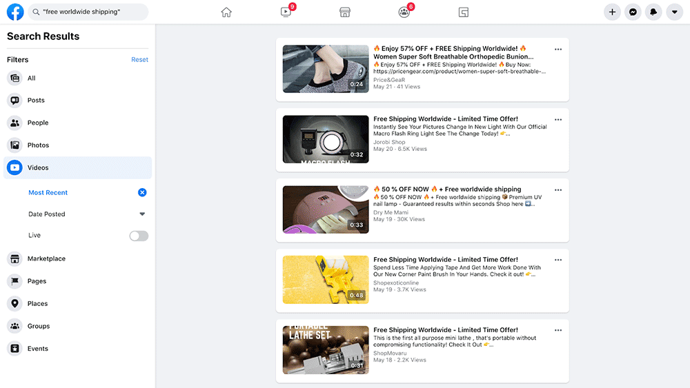 Type, “free worldwide shipping” or “free shipping worldwide” into the Facebook search bar.