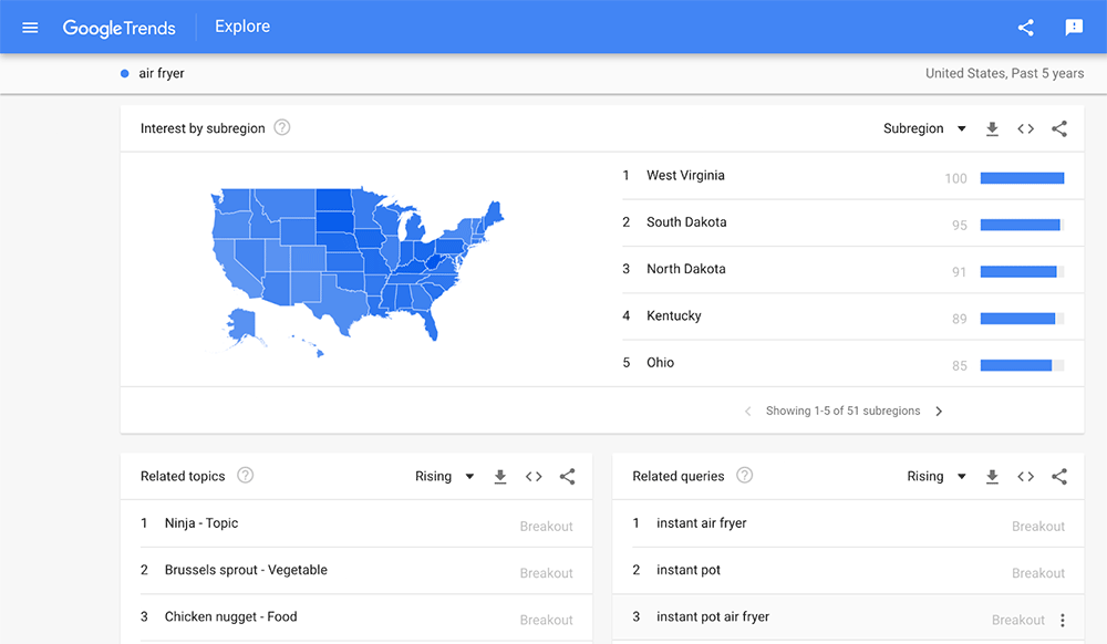 For air fryers, most of the interest is coming from West Virginia and South Dakota.