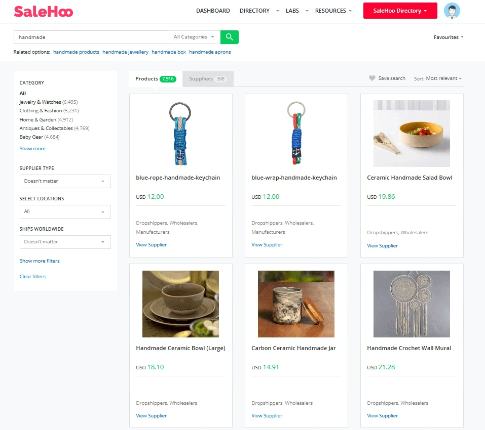 The SaleHoo Directory is one of the best places online to find unique, handmade products at wholesale prices. There are over 8,500 vetted suppliers in the directory, with 7,916 handmade products currently listed.