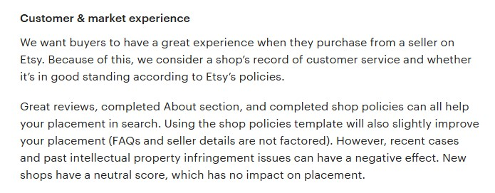 Getting positive reviews will also boost your SEO performance. Here’s how Etsy describes the impact of product reviews and customer service on placement in search results: