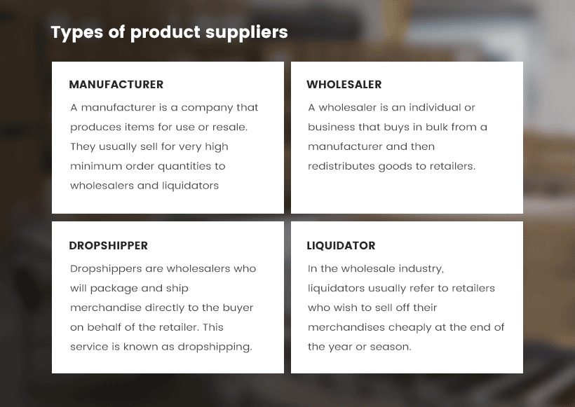 There are four main types of product suppliers that you can contact, depending on how your eCommerce business is set up. They are: