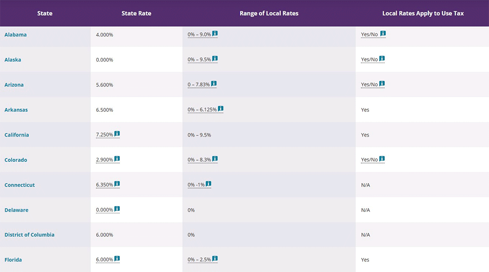 Below is a sample of the sales tax rate for different states. For the complete list and more details, go here.