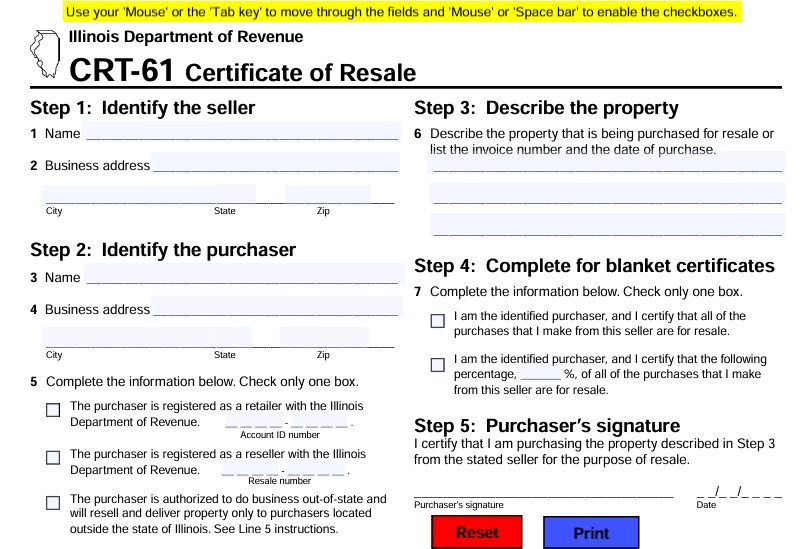 Here's an example of a Certificate of Resale for the state of Illinois: