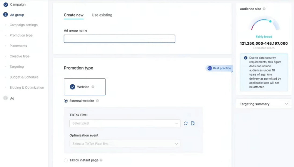 First, you need to name the ad group and select “Website” as the promotion type. Then, choose your TikTok Pixel.