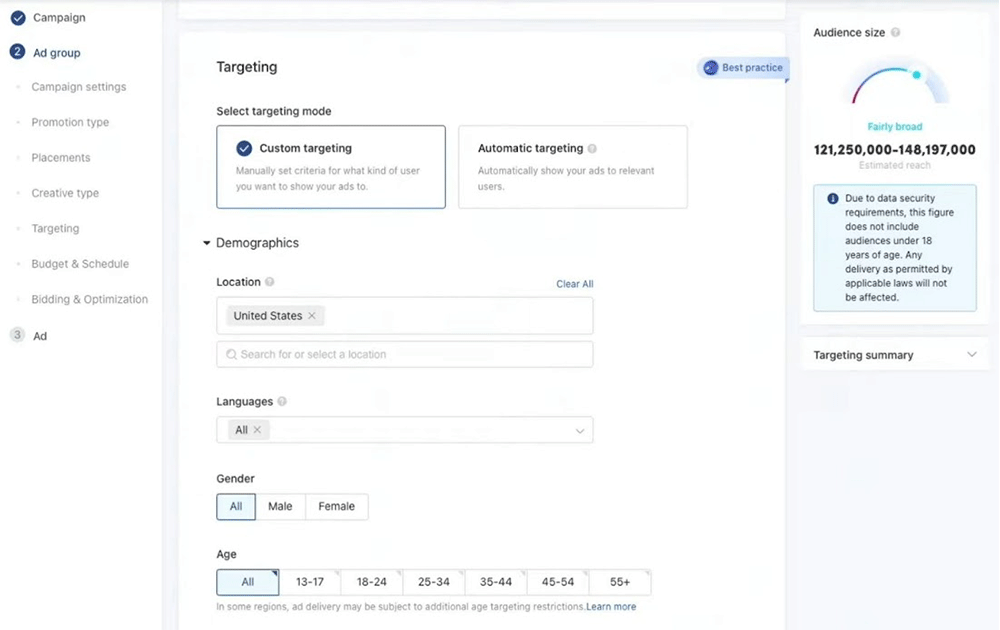 The next step is to set up audience targeting. You can choose the location, language, and age group to narrow in on the users most likely to engage with your TikTok ads and make a purchase.