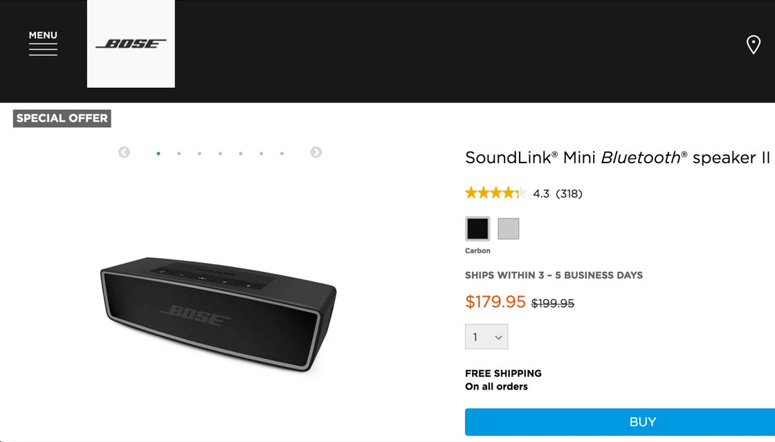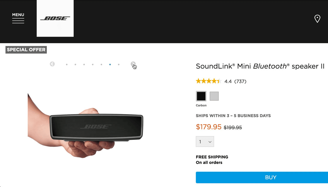 The above image wouldn't immediately give the shoppers an idea about the size of the speaker because there is no in-scale image shown here. This means the shopper has to go through the product description to figure out the actual size of the product. However, the in-scale image below will give the user a better idea of the size of the product.