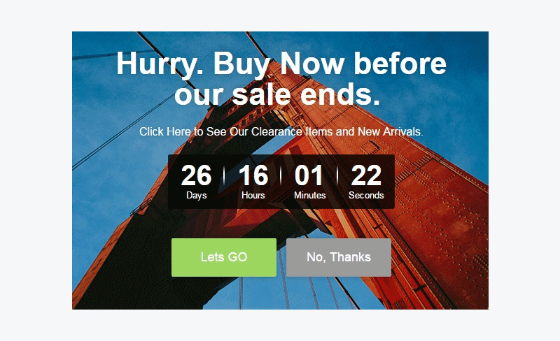 The above image convinces shoppers that time is running out and they need to act immediately in order to secure the massive discount. There’s literally a clock counting down the time before their eyes.