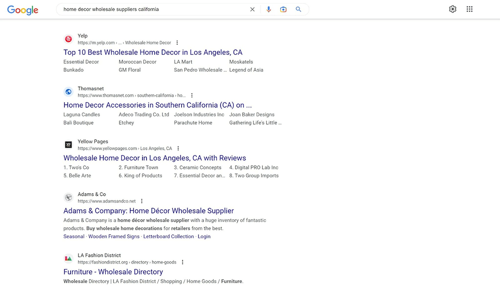 Type in the product you’re looking for and add “wholesale suppliers” or “bulk suppliers” to the search query. This should give you a list of potential suppliers to check out.