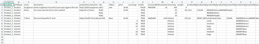 When you open the CSV file, you’ll see rows of sample product information like the example below..